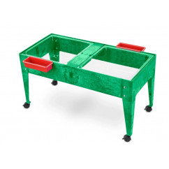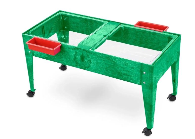 this versatile sensory table features two 9" deep clear tubs ach with a convenient drain plug for easy cleanup. Perfect for water, sand, or STEM-based sensory play, the Double Mite provides space for multiple children to explore together. Includes four 2" locking casters for smooth mobility, two snap-on caddies for storage, and two white plastic lids to keep contents covered when not in use. ey Features: - Dual 9" deep clear tubs for sensory activities and exploration - Includes drain plugs for easy water management and cleanup - Comes with two snap-on caddies and two white plastic lids - Rolls easily on four 2" locking casters for mobility and stability - Durable, all-plastic design for indoor or outdoor classroom use - Available in blue, red, green, sandstone, or milk chocolate frame color Dimensions: 46"L x 21"W x 24"H
